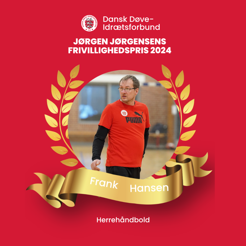 Frank Høyer Hansen modtager Jørgen Jørgensens Frivillighedspris for sit store og vedvarende engagement i døveidrætten. Han har gennem sin indsats i herrehåndbolden lagt et betydeligt stykke frivilligt arbejde og brugt mange timer på at støtte og udvikle spillerne.