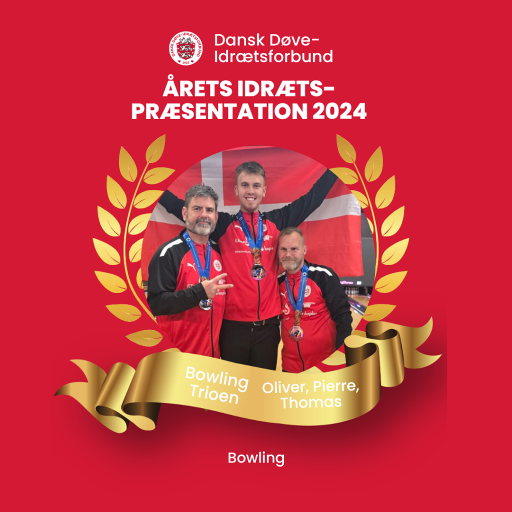Herretrioen i bowling – Oliver Wulff Kristensen, Pierre Bocquet og Thomas Harbo Helstrand – modtager prisen som Årets Idrætspræstation for deres imponerende indsats ved EM i Bruxelles 2024, hvor de vandt sølvmedalje i trio.